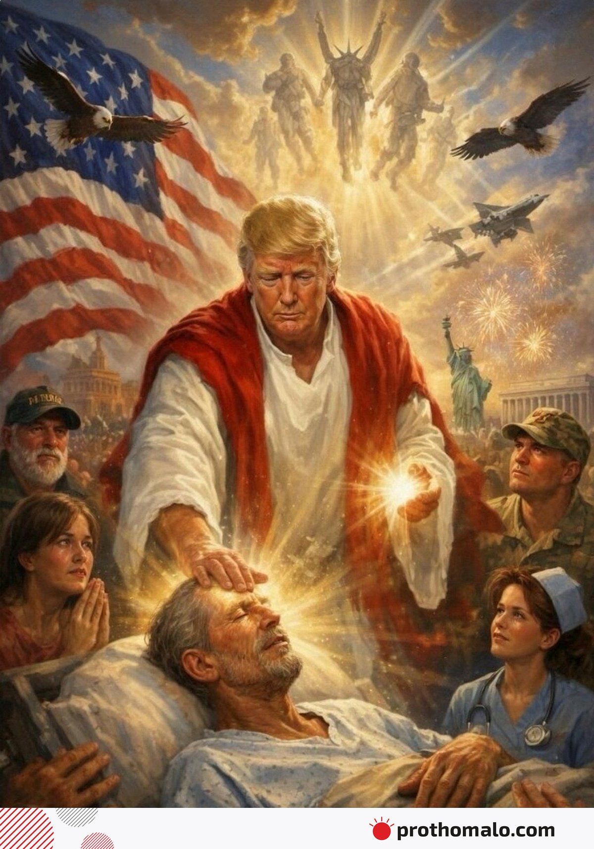 ওই ছবিতে দেখা যায়, প্রেসিডেন্টের দুই হাত থেকে উজ্জ্বল আলো বের হচ্ছে। তিনি হাসপাতালের পোশাক পরে বিছানায় শুয়ে থাকা এক ব্যক্তির কপালে ডান হাত ছুঁয়ে আছেন।