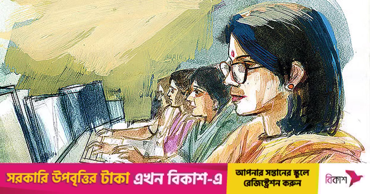 অন্য মেয়েটি বলল, ‘একলা বসে অফিস আওয়ারের পর কাজ করতে হলে প্রমোশনের লোভে বললে তো শোভন শোনায়। তখন বলা হবে, কার মন ভোলানোর জন্য যেন মেয়েটি কাজ করার ভান করে যাচ্ছে!’