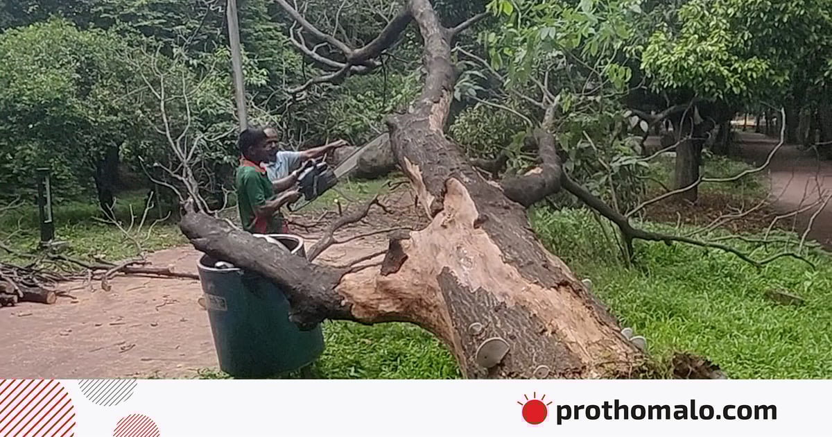 ভোরের ঝোড়ো হাওয়া ও বৃষ্টিতে রাজধানীর রমনা পার্কে একটি বকুলগাছ উপড়ে পড়ে। ২৭ এপ্রিল ওই গাছের ভাঙা অংশ সরাতে কাজ করতে দেখা যায় পার্কের মালিদের। বিস্তারিত ভিডিও প্রতিবেদনে…
