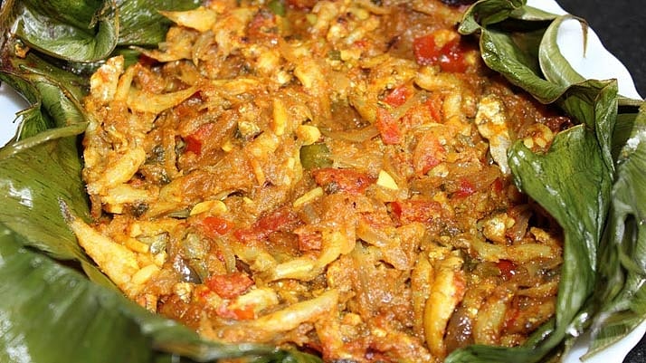 আমাদের বরিশাল-পিরোজপুর-বরগুনা অঞ্চলে খাল, বিল বা নদীতে অনায়াসে যে পুঁটি, ট্যাংরা, মলা, ভেদা, ছোট শোল, টাকি, বাইলা, নানান পদের কাঁঠালি, গোদা বা দোনা চিংড়ি ইত্যাদি পাঁচমিশালি মাছ পাওয়া যায়, তার সঙ্গে সরু কচুর লতি মিশিয়ে কলাপাতায় একধরনের বিশেষ পদ রান্না করা হয়। বরিশাল অঞ্চলের কথ্য ভাষায় একে বলে ‘পাতায় দেওয়া মাছ’।