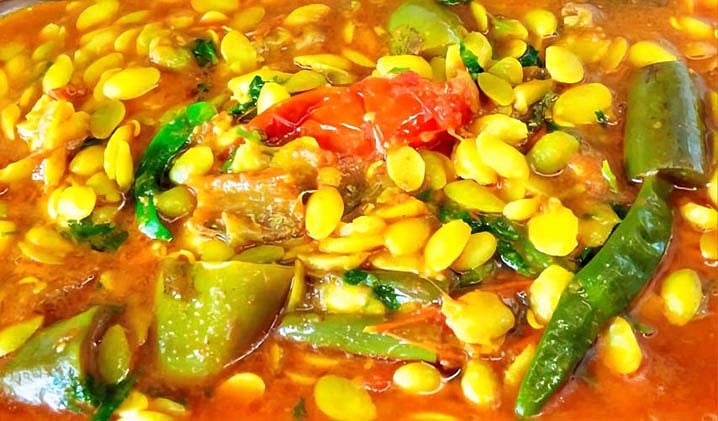 কয়েক মিনিটের মধ্যেই আমাদের টেবিলে দেখা গেল মোটা চালের ধোঁয়া ওঠা ভাত আর ঘন লাল ঝোলের মধ্যে অজস্র উজ্জ্বল সবুজ-হলুদ রঙের শিমের বিচির তরকারি। তা মাঝখানে মাঝখানে ছড়িয়ে-ছিটিয়ে উঁকি দিচ্ছে শিং মাছের টুকরা। সঙ্গে বেগুন আর টমেটো। রান্নার গরমে শিমের বিচি গলে গিয়ে ঝোলকে আরও ঘন করেছে।